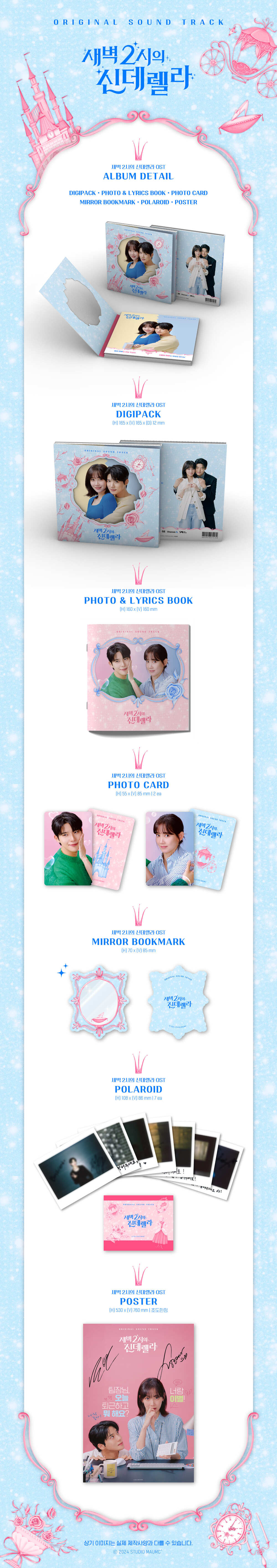 이에, 구성품으로 전 가창자 폴라로이드 7종과 ‘새벽 2시의 신데렐라’를 연상케 하는 미러 북마크 1종, 명대사와 가사지가 담긴 포토북, 주인공 포토카드 2종을 고루 담아 OST를 사랑하는 팬들이라면 누구나 소장하고 싶은 패키지로 찾아왔다.