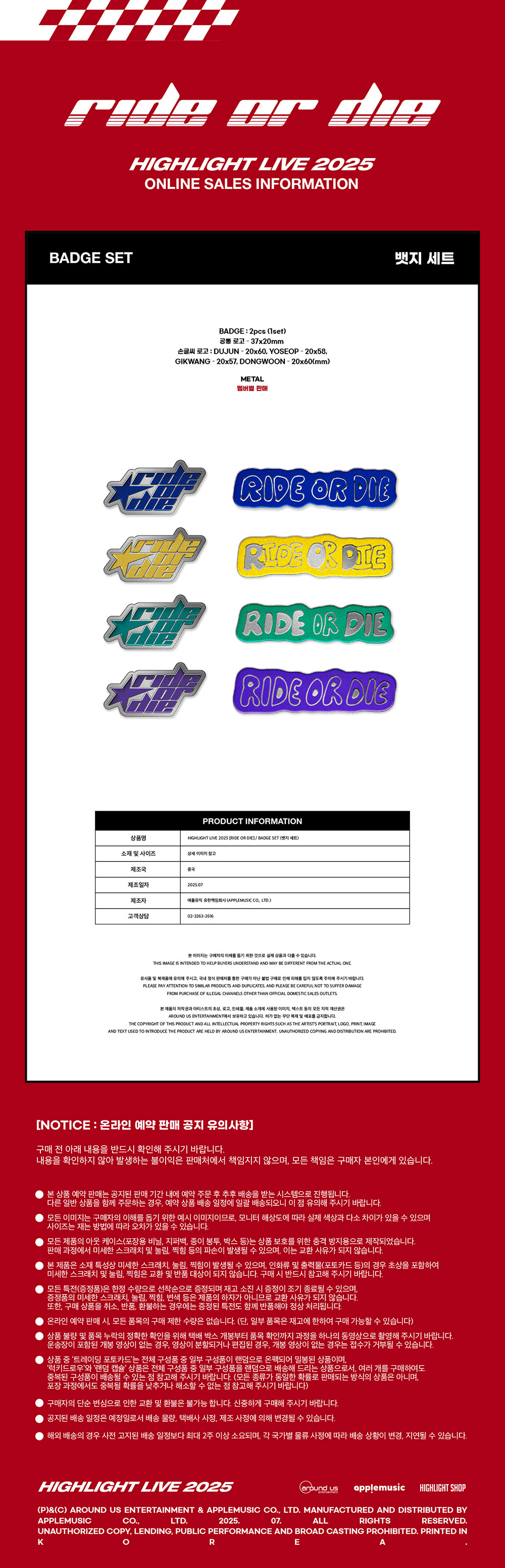 하이라이트 (HIGHLIGHT) - HIGHLIGHT LIVE 2025 [RIDE OR DIE] MD / 뱃지 세트 (BADGE SET)